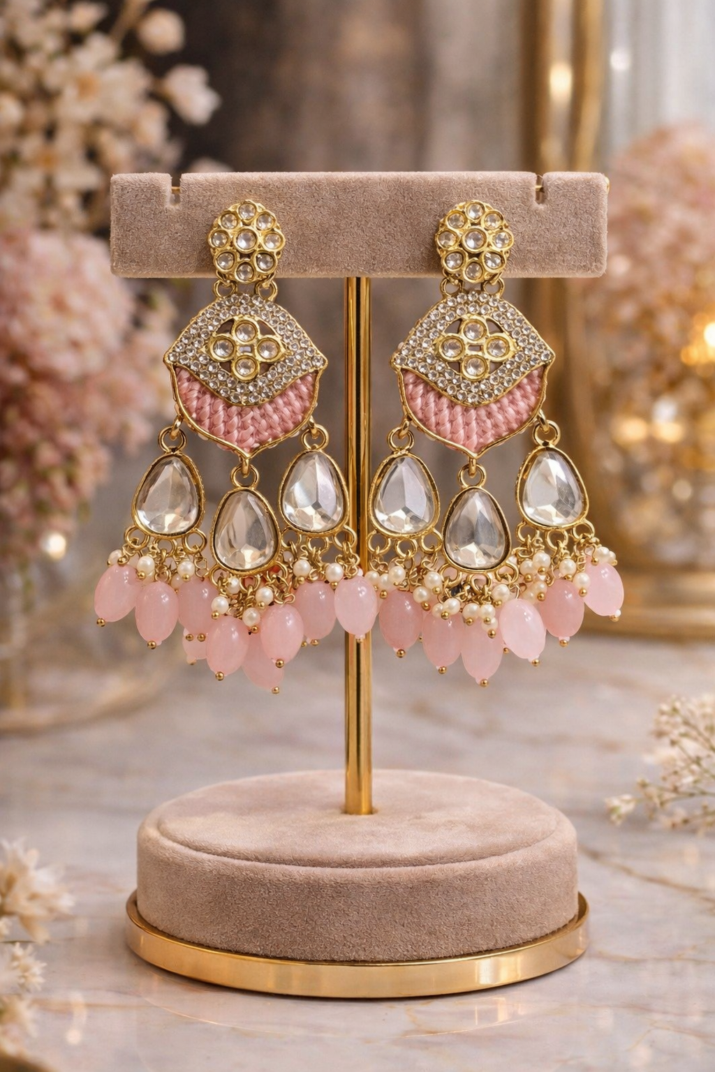 Elegant blush pink drop earrings featuring intricate gold-tone detailing, sparkling crystal stones, and soft pink bead danglers. Designed with a beautiful blend of modern charm and traditional style, these earrings add a graceful and feminine touch to any outfit. Perfect for weddings, festive occasions, and party wear, they are lightweight, stylish, and effortlessly eye-catching.