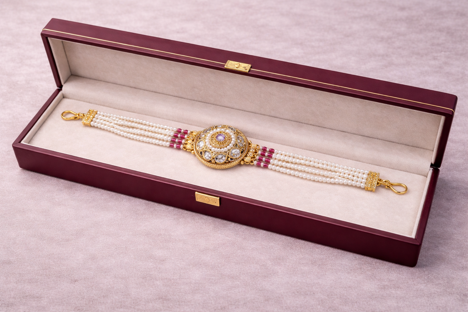 Yeh elegant bracelet high-quality brass base par micro gold plating ke saath beautifully crafted hai. Isme multi-layer white pearls aur center mein traditional kundan design with pink stone detailing diya gaya hai, jo isse rich aur classy look deta hai.