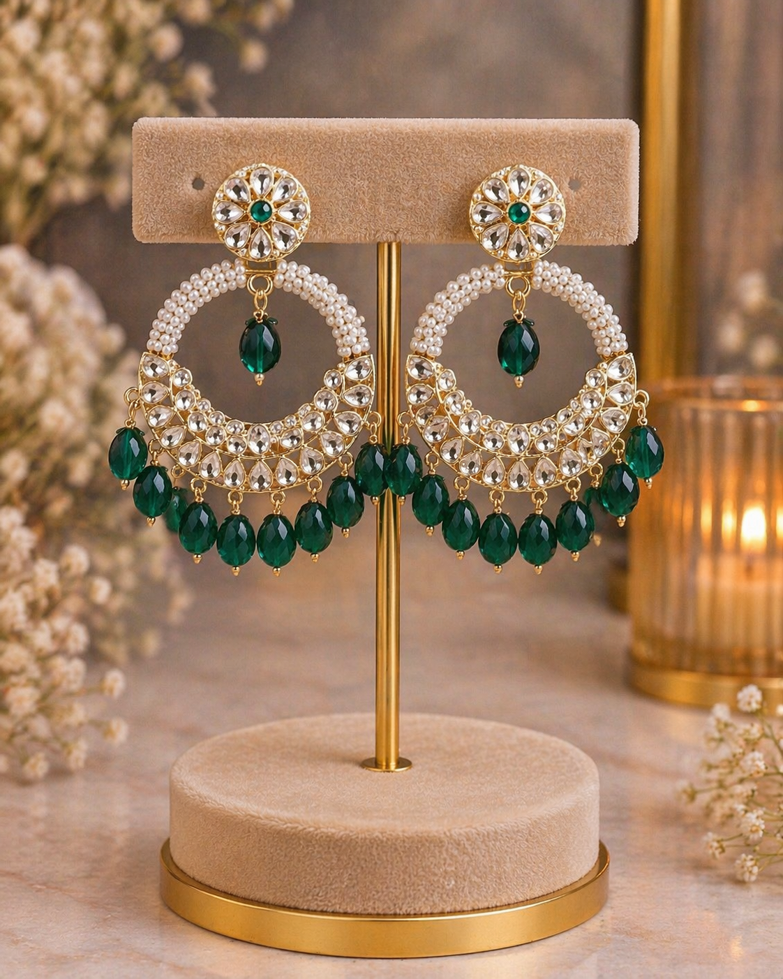Be the first to review “Elegant Emerald Pearl Hoop Chandbali Earrings 💚✨”