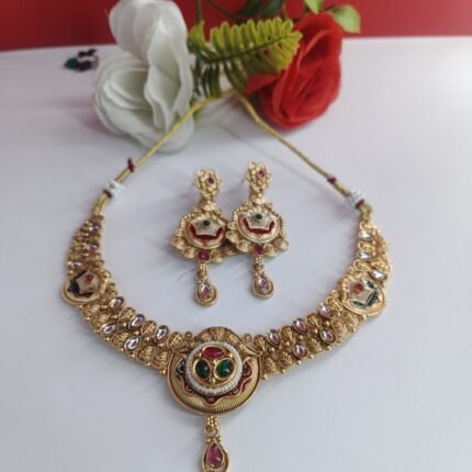 Elegant and eye-catching necklace set featuring deep emerald-green stones and sparkling AD crystals in a graceful twist design. The statement pendant adds a royal touch, while the matching earrings complete the look beautifully.