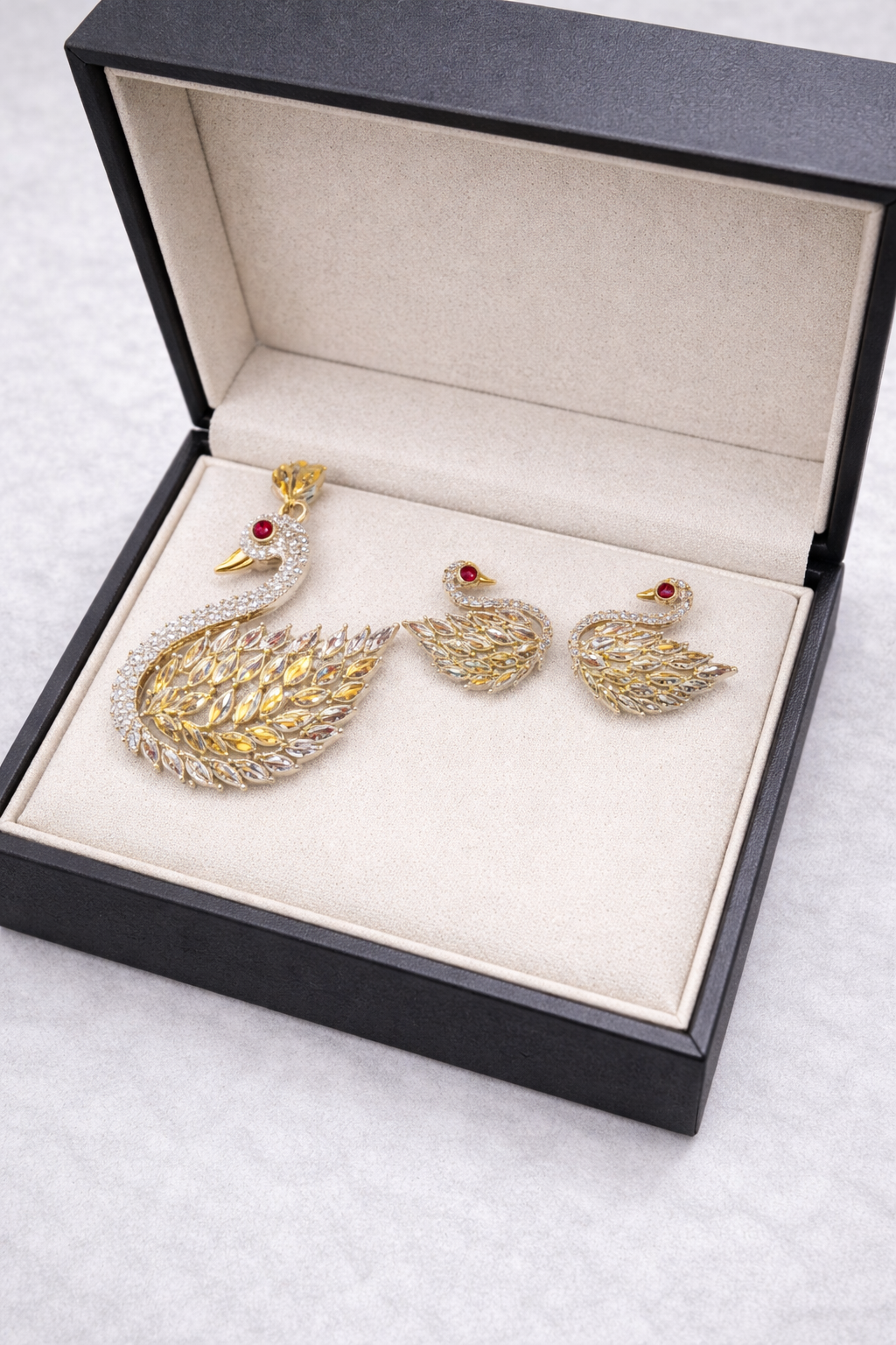 Beautiful golden peacock pendant set elegantly presented in a premium velvet box. Designed with sparkling white stones, golden marquise detailing, and rich red stone accents on the head for a royal finish. This set includes a statement pendant with matching earrings, perfect for weddings, festive occasions, and special events. A graceful and luxurious addition to your jewelry collection. ✨💛