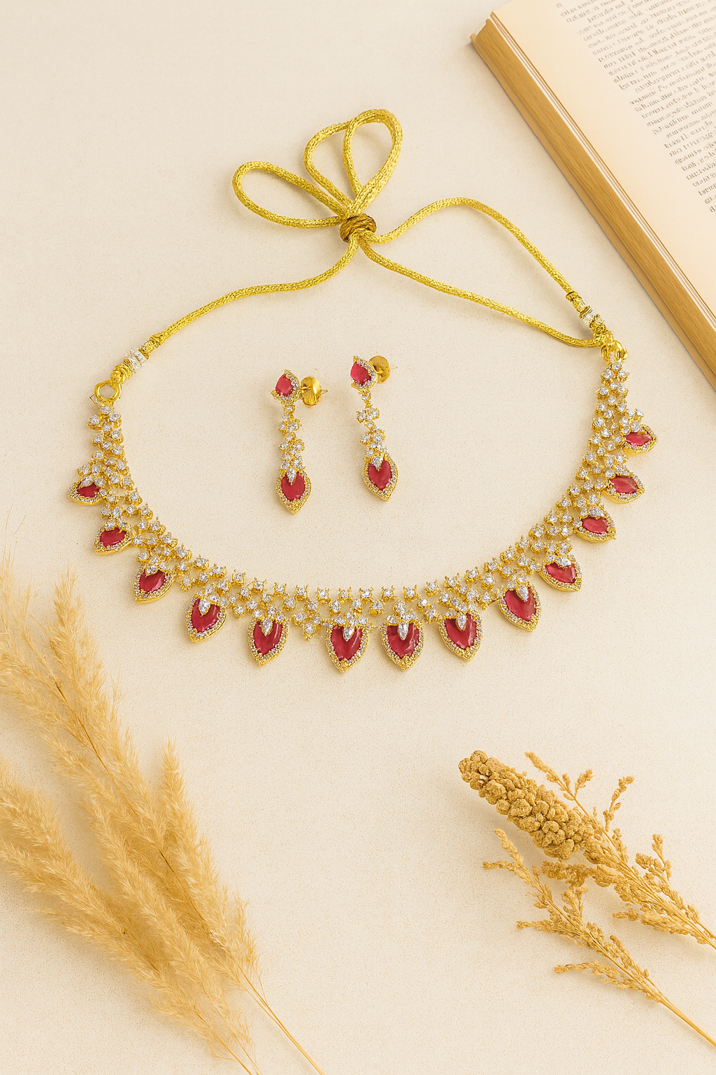 Gold plated ruby AD necklace with fine detailing and luxurious finish.