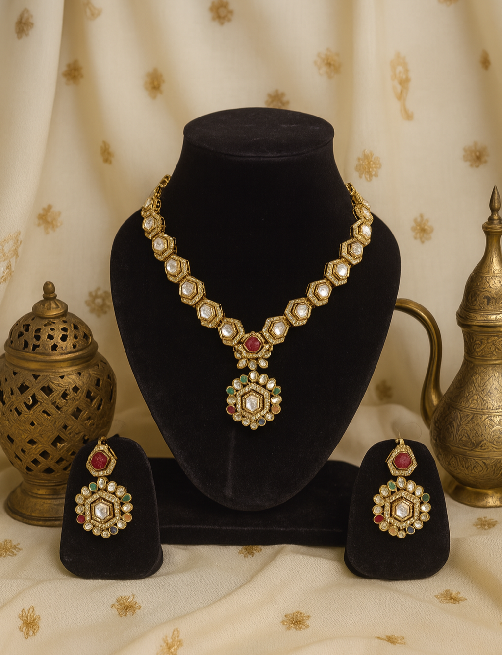 Beautiful multi-colour Kundan necklace set crafted with premium stones, giving a vibrant and elegant festive look. Perfect for weddings, parties, and traditional outfits.