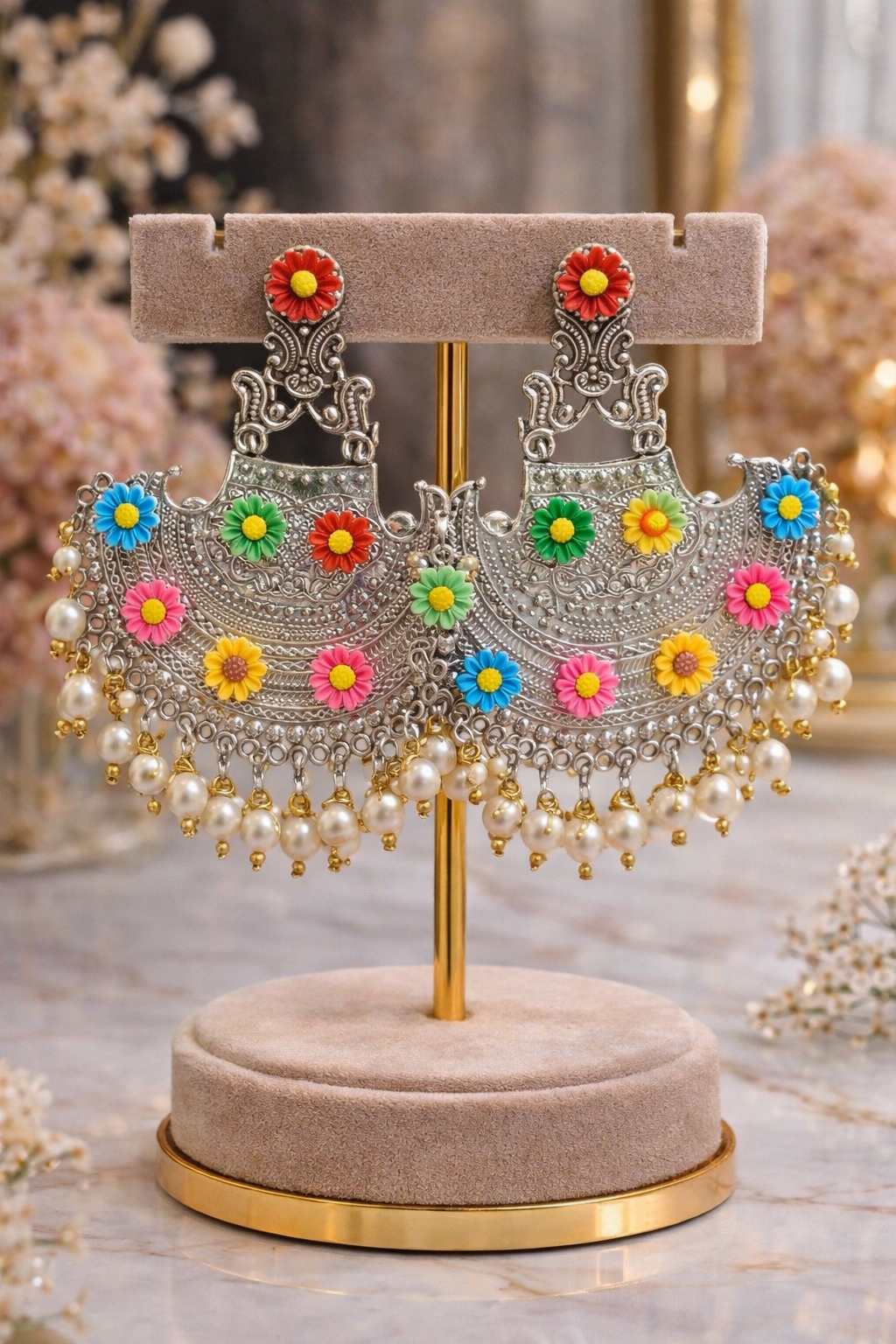 Vibrant multicolor chandbali earrings crafted with intricate silver-tone detailing, adorned with colorful floral accents and elegant pearl danglers. These statement earrings bring a playful yet traditional charm, perfect for festive wear, mehndi functions, and ethnic outfits. Lightweight and eye-catching, they add a bright, joyful touch to your overall look.