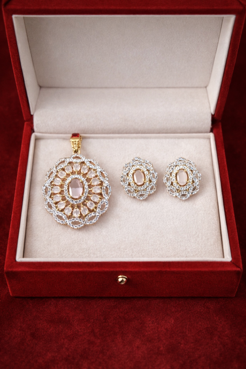 Beautiful floral-style pendant set with a soft rose-tone center stone and sparkling crystal detailing. The round layered design gives a delicate and elegant look. Gold-tone finish adds richness while keeping it lightweight and comfortable to wear. Perfect for parties, festive wear, and special occasions. Comes with matching earrings for a graceful complete set. ✨