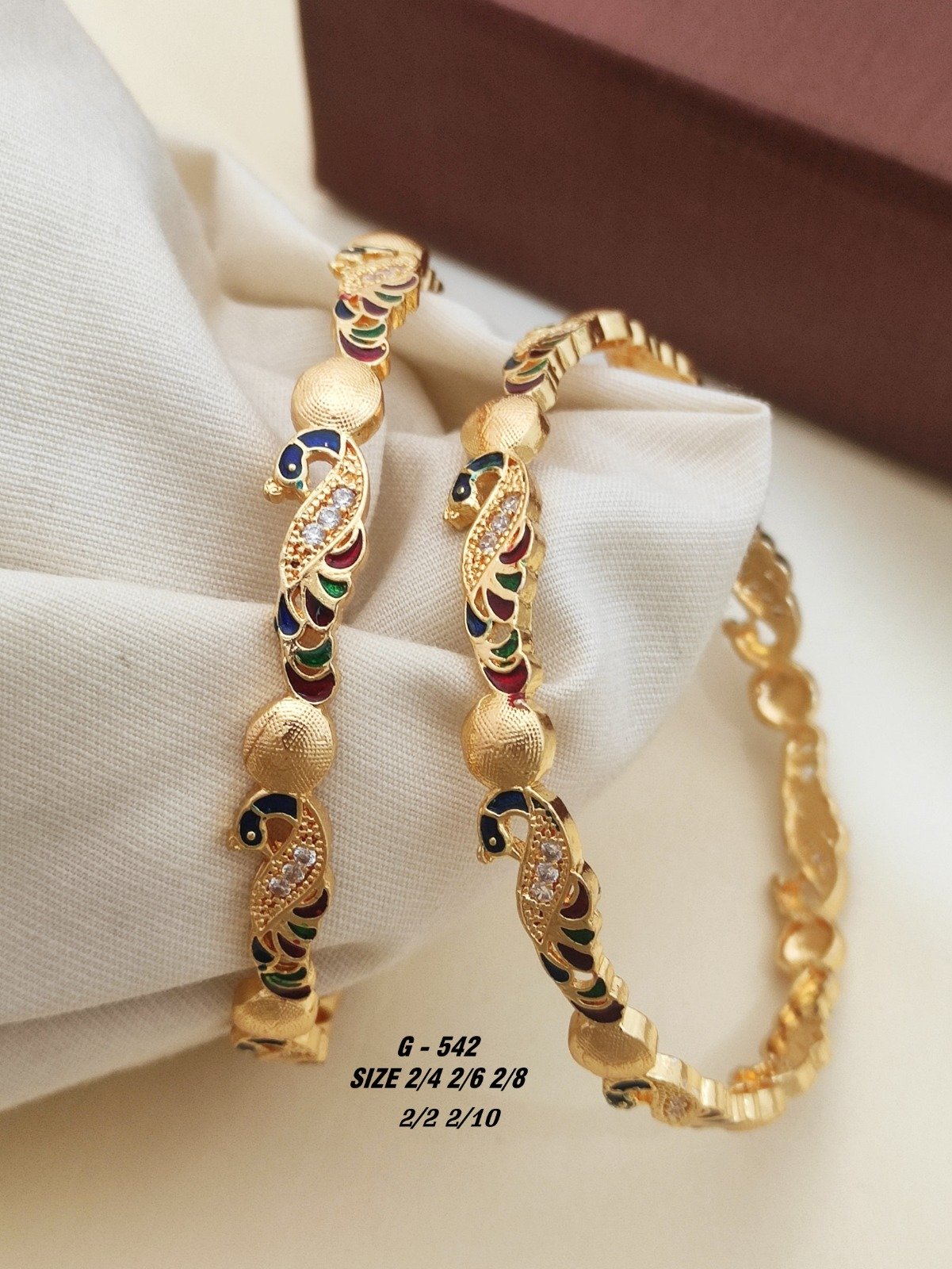 Add a touch of royal elegance to your look with these beautifully crafted peacock design bangles. Featuring intricate meenakari work with vibrant colors and a luxurious gold-plated finish, these bangles reflect timeless tradition with a modern charm. The delicate peacock motifs enhanced with fine detailing and sparkling stones make them perfect for festive wear, weddings, and special occasions.