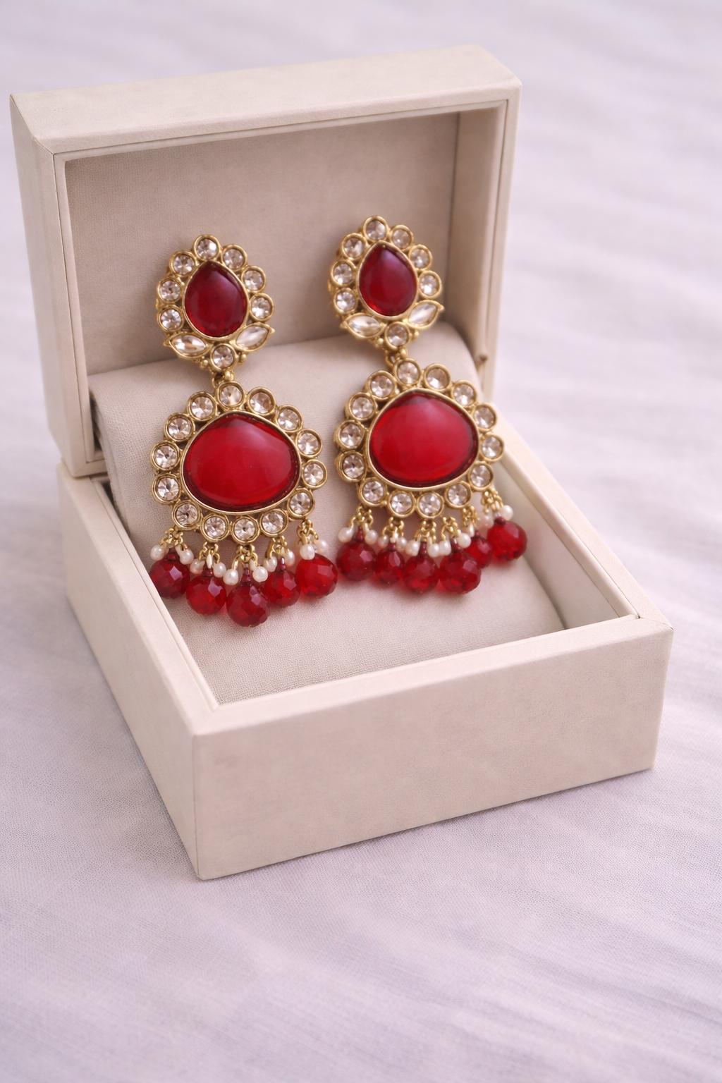 Add a touch of glamour to your look with these beautiful fancy red stone earrings. Designed with a rich red centerpiece and surrounded by sparkling stones, these earrings offer a perfect blend of elegance and style. The delicate bead drops enhance the overall look, making them ideal for festive and special occasions.