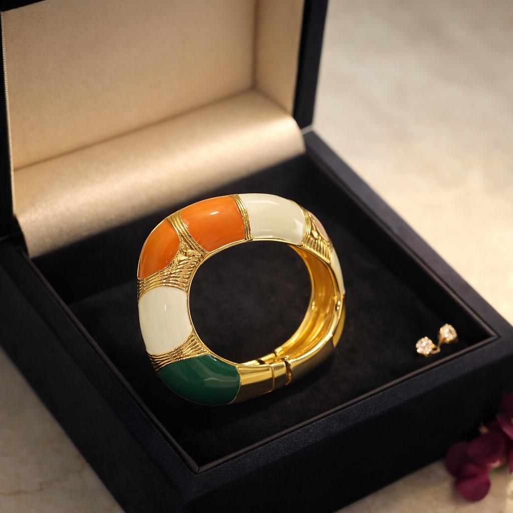 Celebrate elegance with a touch of heritage through this stunning tricolor enamel bracelet, beautifully designed with vibrant saffron, ivory, and green tones enhanced by rich gold-tone detailing. Inspired by classic color harmony, this bracelet brings a unique blend of tradition and modern style, making it a perfect statement piece for every occasion.