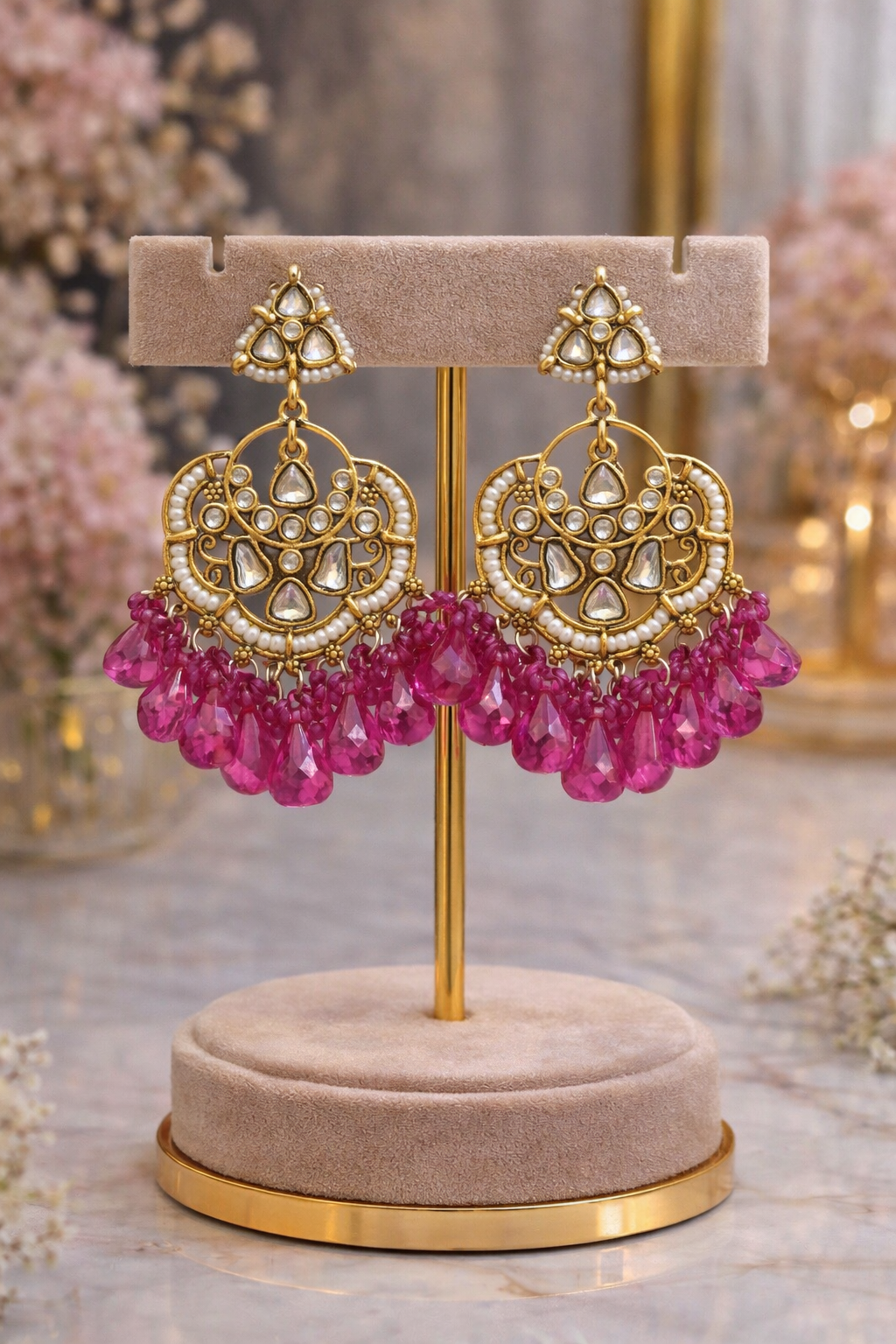 Ruby Pink Chandbali Drop Earrings 💖