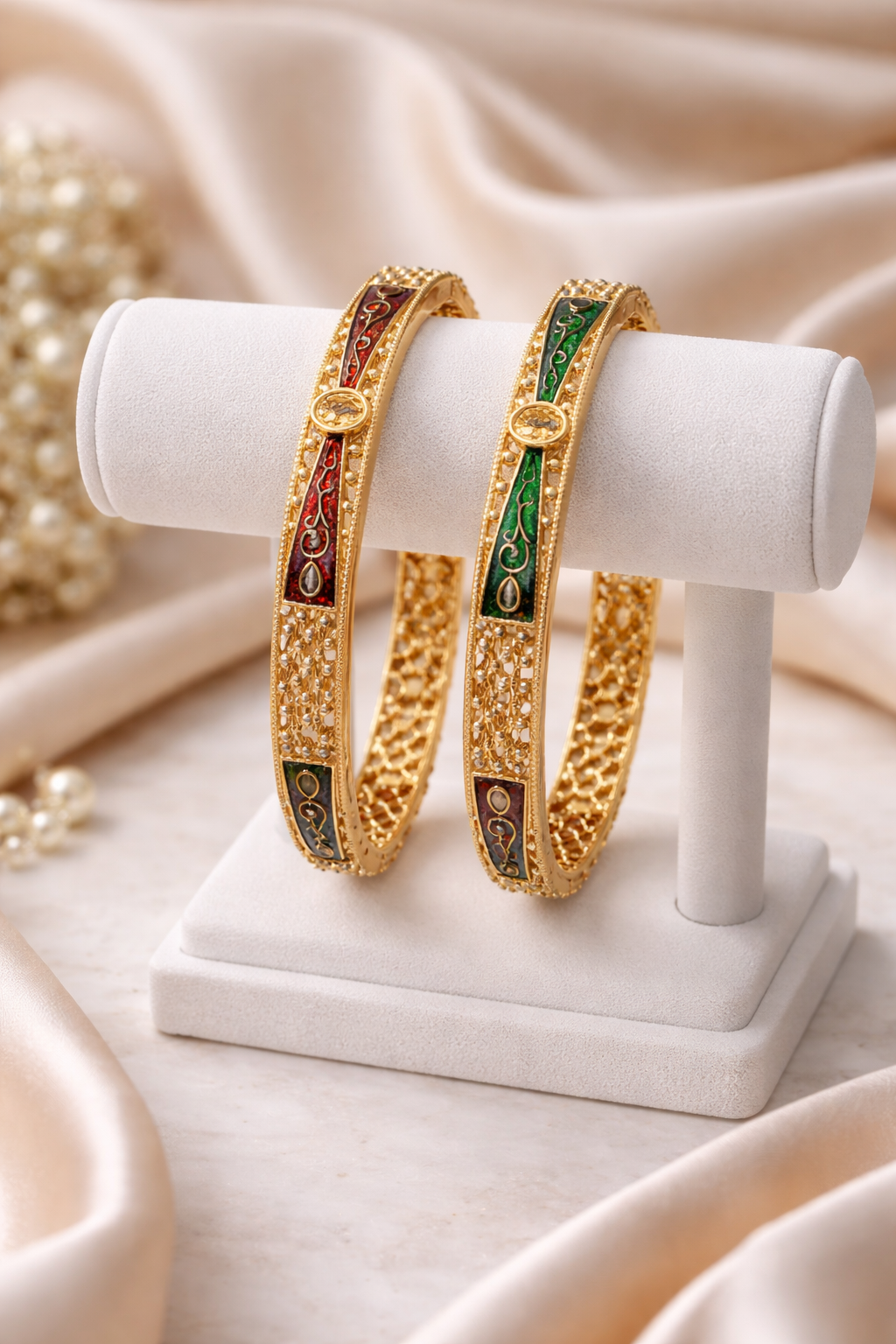 Beautiful gold-plated designer bangles with traditional red & green meenakari work and fine filigree detailing. Perfect for weddings, festivals, and ethnic wear.