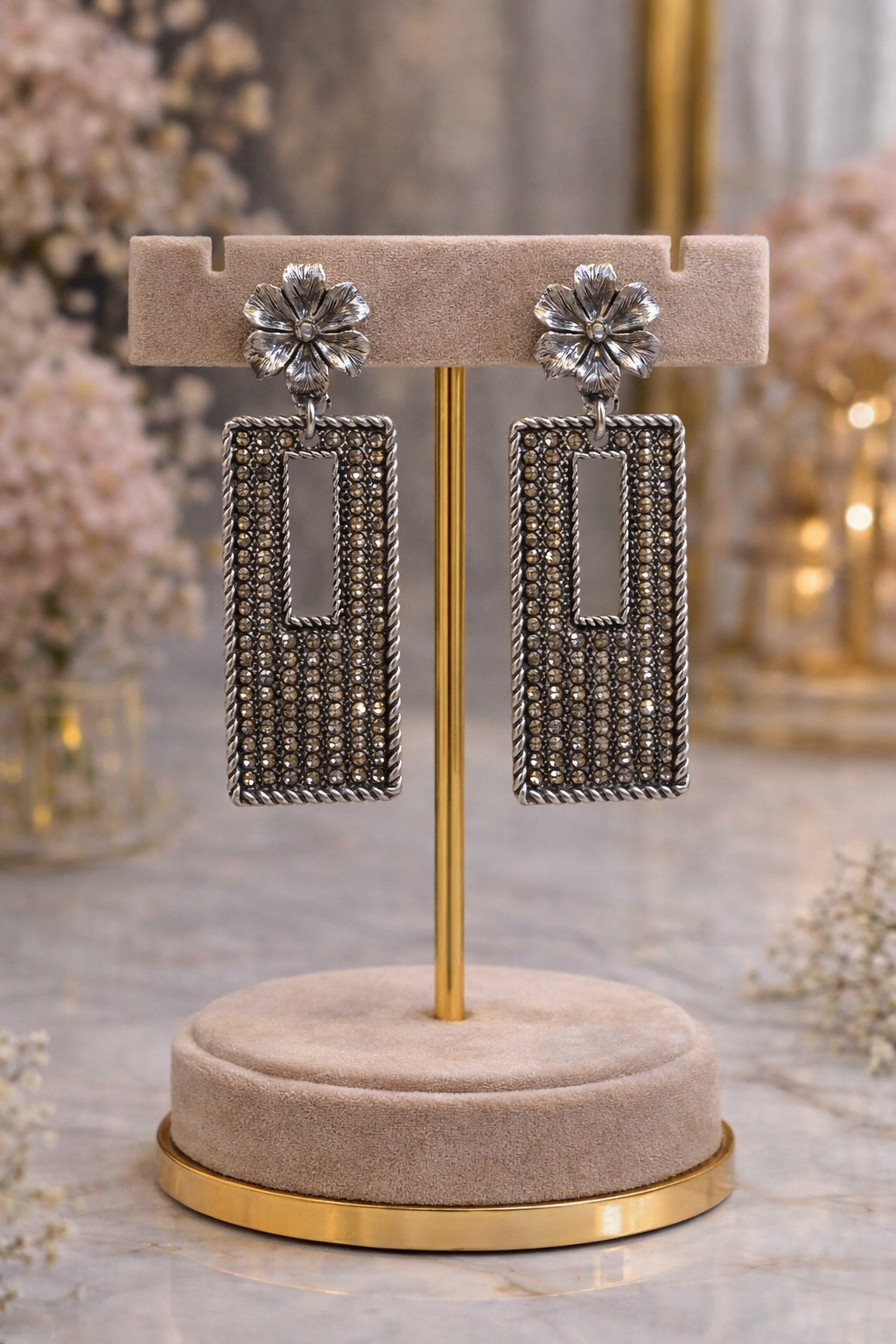 Stylish antique-finish drop earrings featuring a unique rectangular design adorned with intricate crystal detailing and elegant floral studs. These statement earrings offer a perfect blend of vintage charm and modern elegance, making them ideal for parties, festive occasions, and fusion wear. Lightweight and eye-catching, they add a classy and sophisticated touch to your overall look.